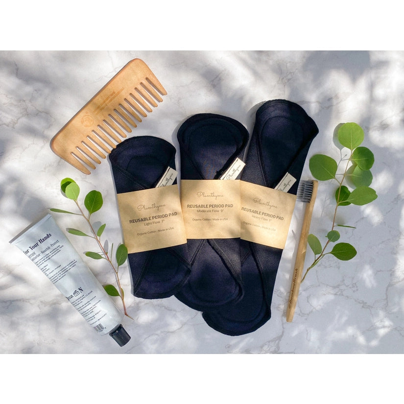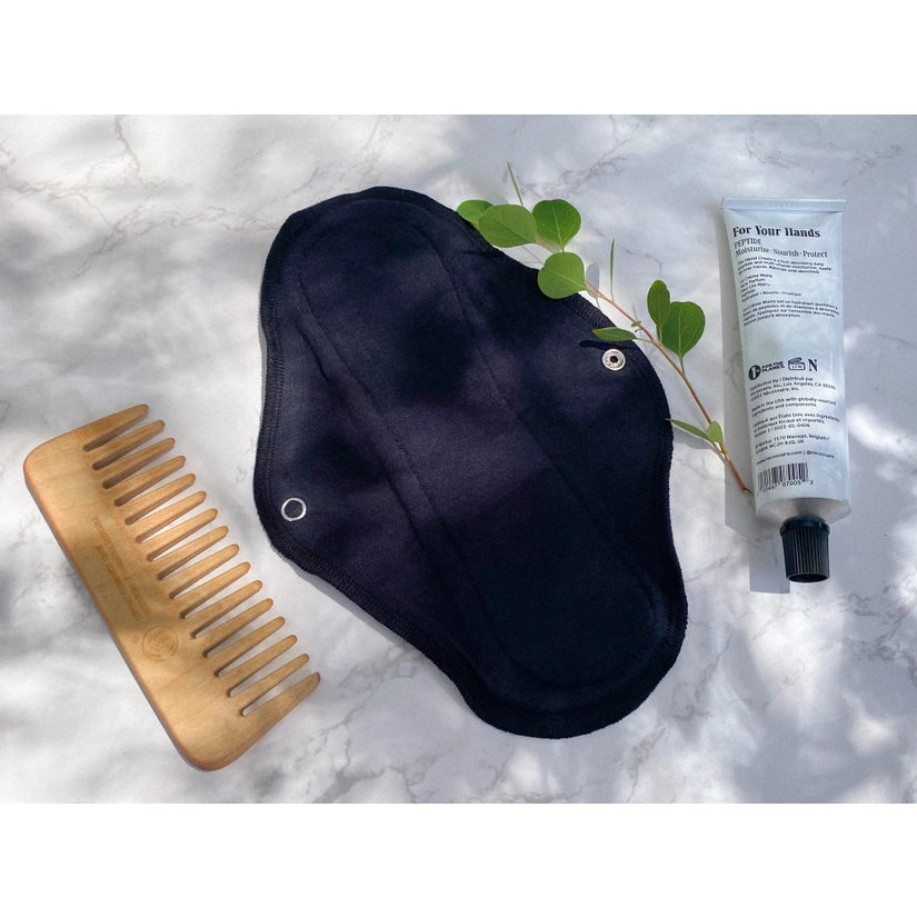 Thin but totally leak-proof, perfect for the last couple of days of your period or as a panty liner. Each pad features leak-proof PUL back layer. Closest to your skin is the softest 100% organic cotton in black color (forget about stains!). Inside of the pad is 1 layer of Zorb® (US-produced super-absorbent antibacterial hypoallergenic fabric engineered to rapidly capture and distribute moisture with superior holding capacity). Open ring metal snap keeps the pad in place. Wear logo side facing your underwear. Light flow pad is approximately 7" long and 2.75" wide when snapped. PlumThyme pads are easy to care for – washing instructions available at plumthyme.com Made in the USA from USA-manufactured materials.